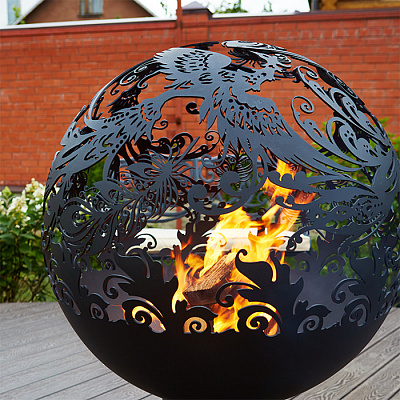 Уличный очаг Жар-птица Firecup представляет собой сферу из металла, на которой вырезана жар-птица руками профессионального мастера. Через многочисленные прорези просвечивает пламя, озаряя все вокруг. Несмотря на уникальный дизайн, кострище отлично вписывается в любую обстановку как во дворе, так и на природе.