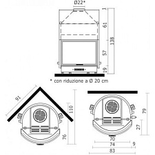 Стальной корпус покрыт качественным лакокрасочным покрытием, даже при первой растопке, пользователь не ощутит неприятного запаха. Внутри топка защищена белыми панелями Keramiton, специального керамического сплава. Г-образная дверца имеет боковое открытие, оснащена составным стеклом с трафаретной печатью и ручкой с перфорированной структурой для естественного охлаждения.